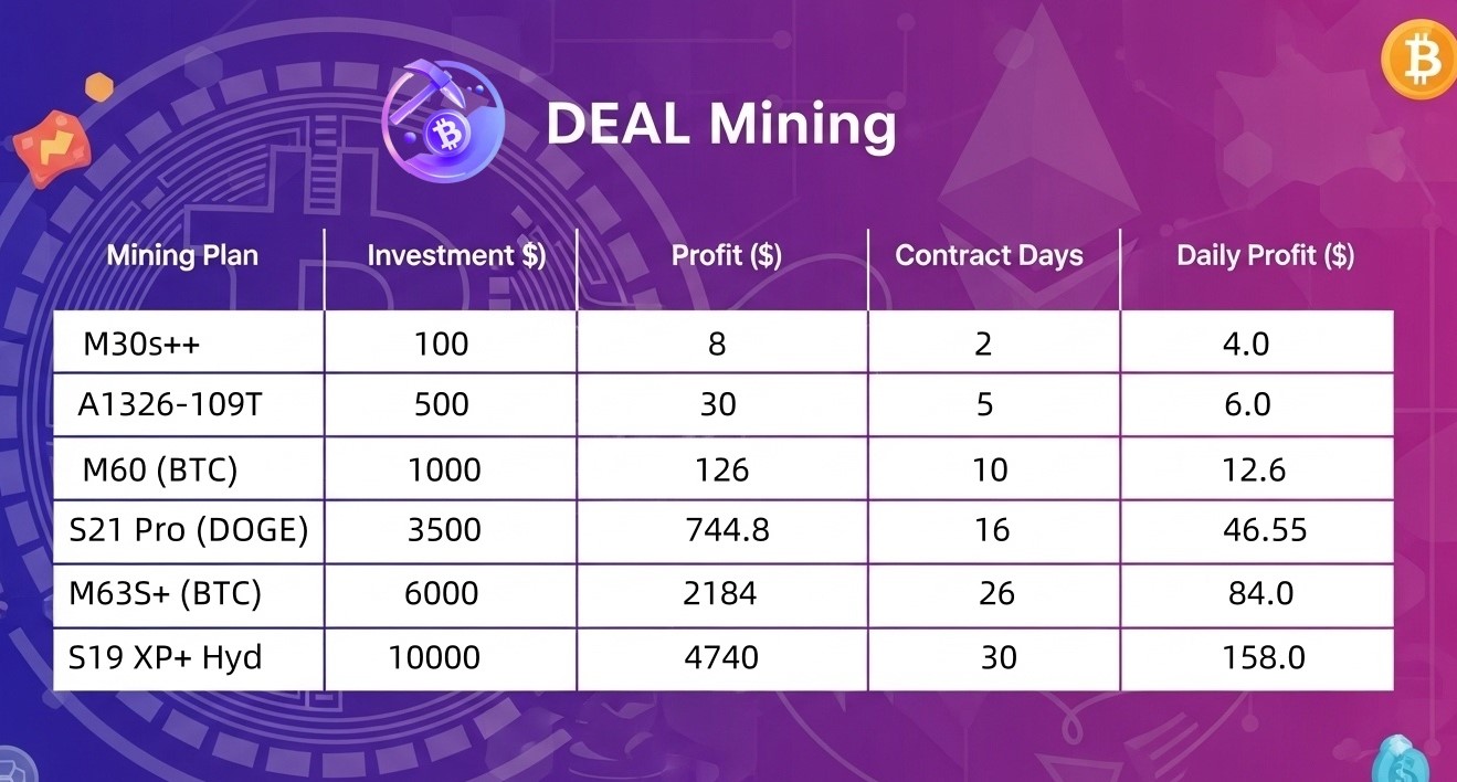 Founded in 2016 and headquartered in the UK, DEAL Mining is a leading global cloud mining platform dedicated to providing users with simple, secure, and environmentally friendly cryptocurrency mining services. The platform supports a variety of mainstream cryptocurrencies, including BTC and XRP. Using AI-powered computing optimization and green energy data centers, users can earn daily passive income through cloud mining without having to purchase mining machines or incur high electricity costs.