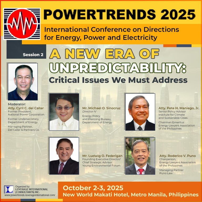 Organized by Leverage International (Consultants), Inc., in cooperation with the Department of Energy, local and international supporting organizations, the two-day conference brings together a distinguished lineup of policymakers, regulators, business executives, and innovators to address the urgent challenges facing the power sector amid geopolitical shifts, economic disruptions, and the accelerating push for clean energy.