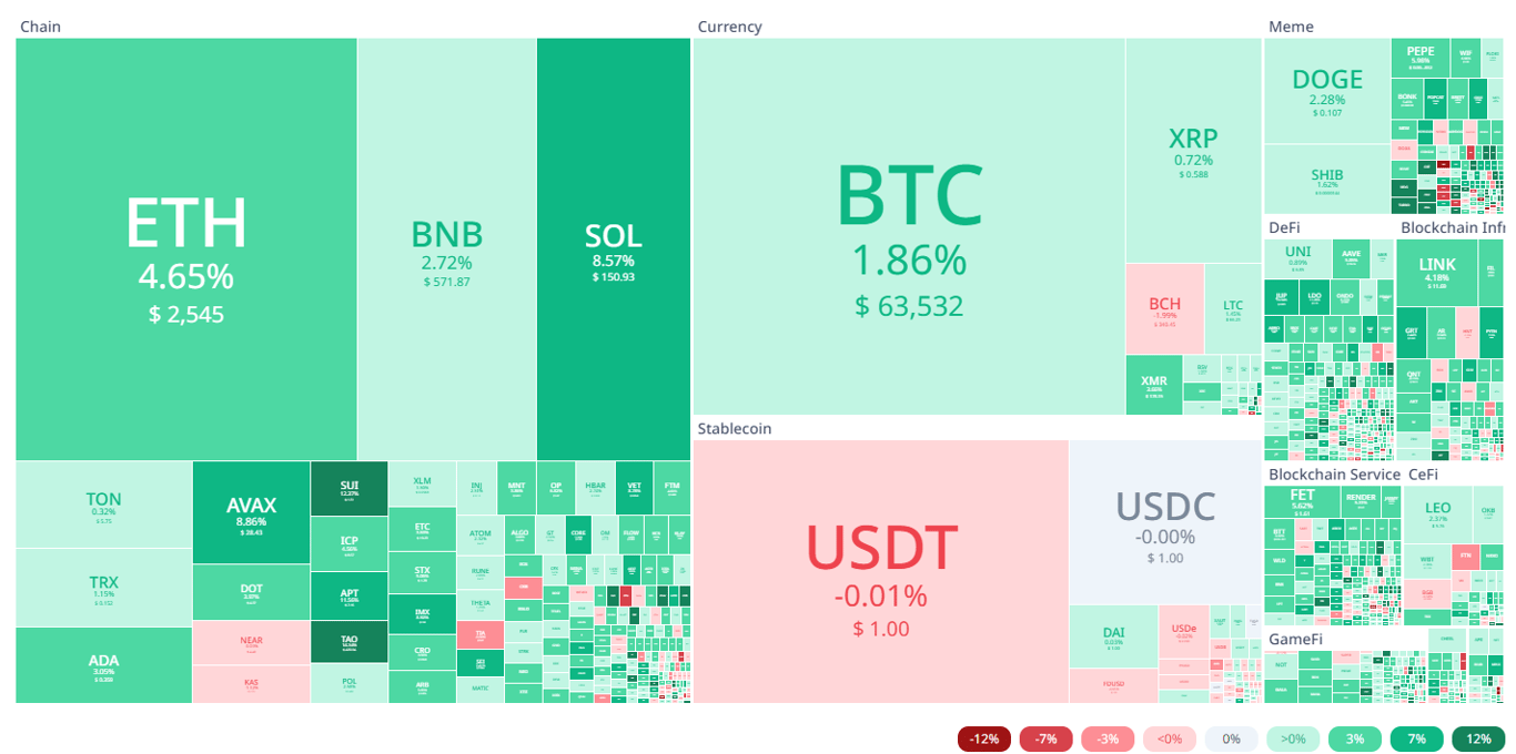 Bitcoin recorded its price at $63,532 with an increase of 1.8% in 24 hours. Then there is Ethereum which has recently experienced a decline and even received a bad reaction from its holders because the price continues to fall. But now, ETH is up 4.65% and has a price of $2,545.