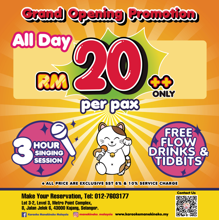 Karaoke Manekineko Malaysia, one of the nation’s most popular karaoke chains, is thrilled to expand its presence with the launch of a brand-new outlet at Metro Point Complex, Kajang. To mark this special occasion, Karaoke Manekineko is rolling out a grand opening promotion that is sure to delight all karaoke lovers.