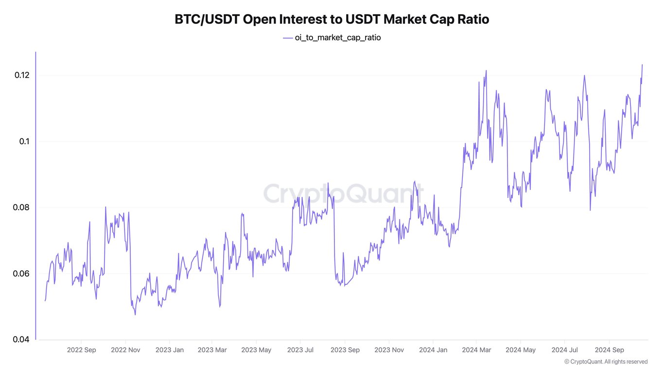 Ki Young Ju, CEO of CryptoQuant, analyzed two important metrics: the ratio of BTC-USDT open interest to reserves and the ratio of BTC-USDT open interest to USDT market capitalization. These two metrics indicate a significant increase in leverage in the Bitcoin futures market.