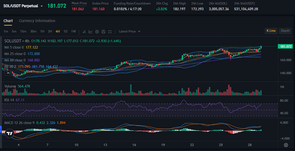 It can be seen from the Solana futures price chart above. The RSI, MACD, and Bollinger Bands indicators show the positive side. Solana’s RSI is at 67.11, which means the buying trend is greater than the selling trend in the sense that it is positive, not overbought. The MACD line is also above the boundary line so the bullish signal is very strong at the moment.