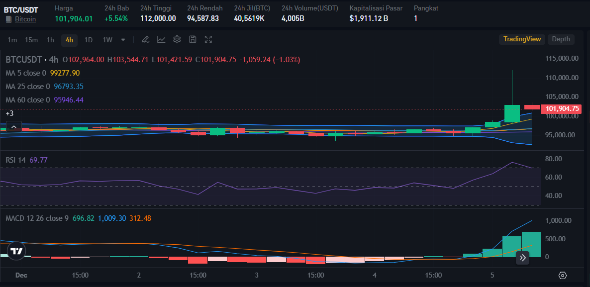 As you can see from the price chart above, at the time of writing this article on December 5, Bitcoin was at $101,904 with a 5.54% increase. In fact, in the last 24 hours, the price of BTC reached $112,000.